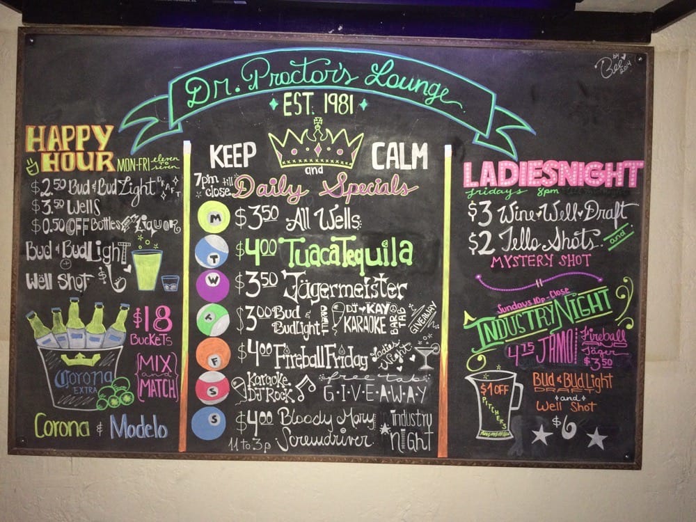 With a full bar, happy hour specials, and welcoming staff, your experience at Dr Proctor's will be memorable. Expect a lively atmosphere amidst pool tables and a jukebox, where friendly bartenders craft your favorite drinks with a smile, making every visit feel special.